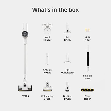- What’s Included: VCN 5 Stick Vacuum, Wall Hanger with Accessory Ports, HEPA Filter, Multi-Purpose Rollerbrush, Hard Floor Rollerbrush, Crevice Nozzle, 2-in-1 Dusting Brush, Upholstery Nozzle, Flexible Hose, Pet Fur Upholstery Tool, Pet Grooming Brush, Battery, Charger