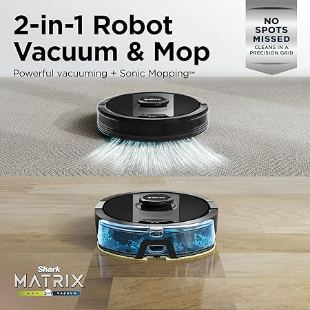 - WHAT’S INCLUDED: (1) Shark Matrix Robot, (1) Charging Dock, (1) Side Brush, (1) Filter, (2) Microfiber Reusable Mopping Pads, 12oz. Starter VACMOP Cleaning Solution.